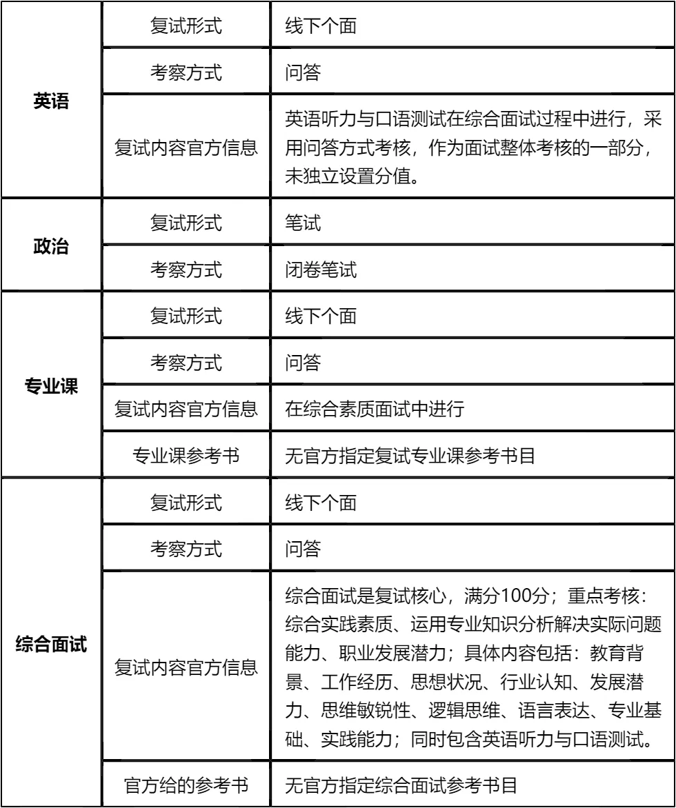客观分析一波,清华大学深圳国际研究生院非全日制MBA复试淘汰率30%,属于中等偏上淘汰水平,复试时间预计在2026年3月21日左右,查分后准备时间有限,需要提前规划复习。整体复试以面试+笔试为主,面试形式为线下个面,考察维度全面,包括英语、政治、专业课和综合能力,竞争压力较大。