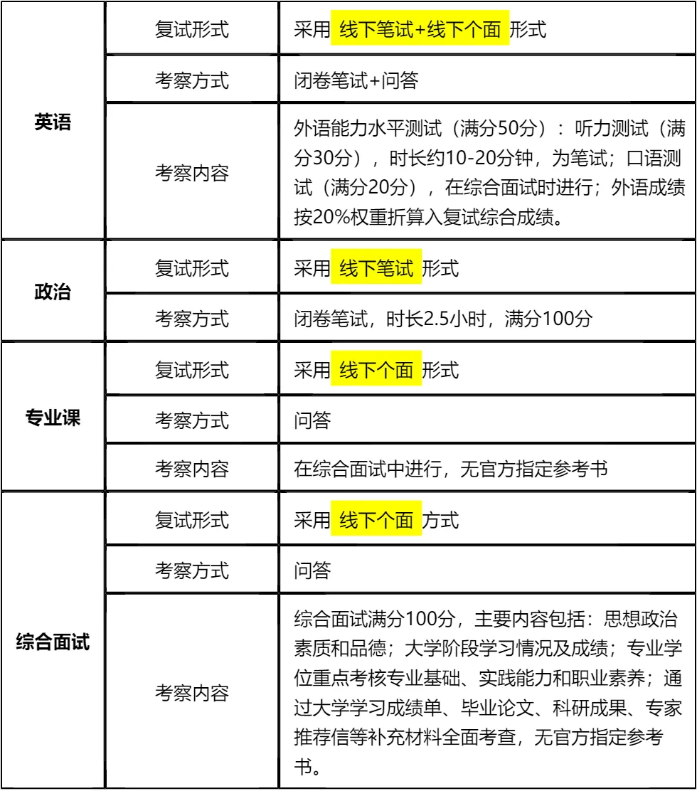 复习建议:复试涉及英语笔试+口语、政治笔试、专业课面试、综合面试多个环节,其中英语听力和政治笔试需提前系统性复习,专业课和综合面试无官方指定参考书,需结合行业经验和核心知识点准备。真题是核心复习资料,文末整理了各版块高频真题,下载后需重点背诵演练,合理分配时间攻克各版块难点,避免偏科,整体难度适中,认真准备即可稳妥应对!!!