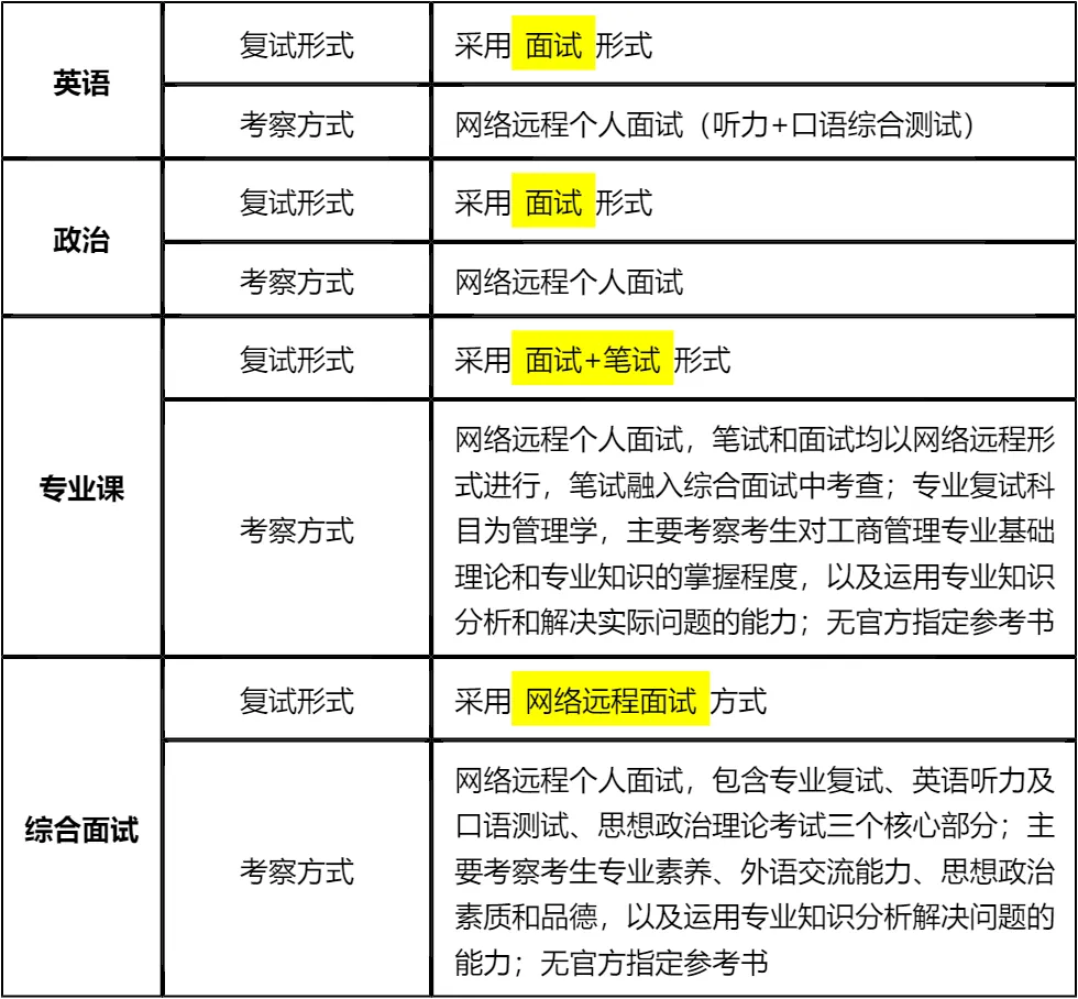 首先,天津商业大学MBA复试采用网络远程形式,整体考察较为全面,涵盖英语、政治、专业课和综合面试四大板块,复试成绩权重分配清晰,需针对性分配复习时间。政治有明确的60分合格线,是录取的基础门槛,务必重视。