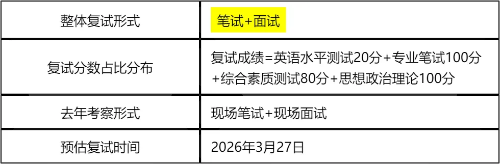 客观分析一波,重庆师范大学全日制MBA复试整体淘汰率55%(中等偏高),复试时间预计在 2026 年 3 月 27 日左右,查分时间(2026年2月24日)和复试时间间隔约32天,时间相对紧张,需要提前系统准备。复试形式为笔试+面试,涵盖英语、政治、专业课、综合面试四大板块,其中专业课有明确合格线(60分),不合格者直接不予录取,需重点关注。