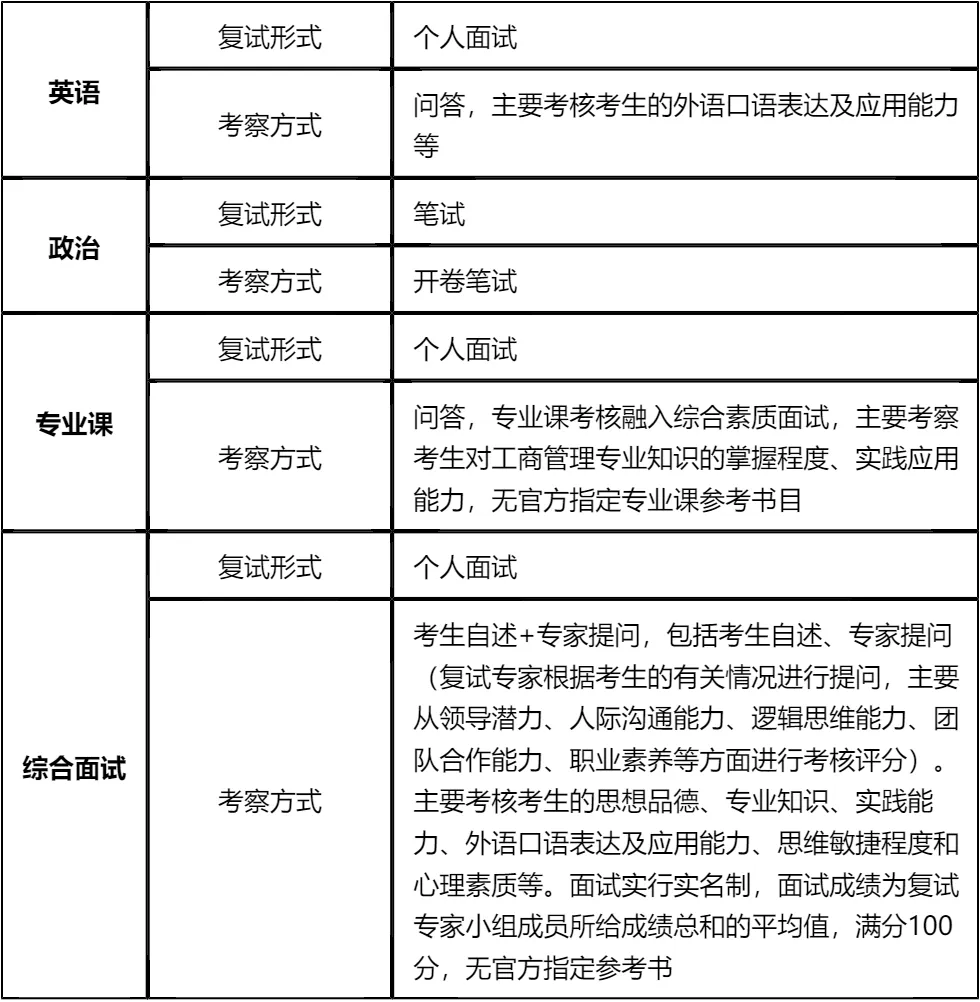 其次,复试形式包含笔试和面试,政治为开卷笔试,需提前梳理核心考点和答题思路,提高答题效率;英语、专业课、综合面试均为个人问答形式,需重点打磨自我介绍,夯实工商管理专业基础,梳理职业经历和行业认知,展现自身综合素质和发展潜力。