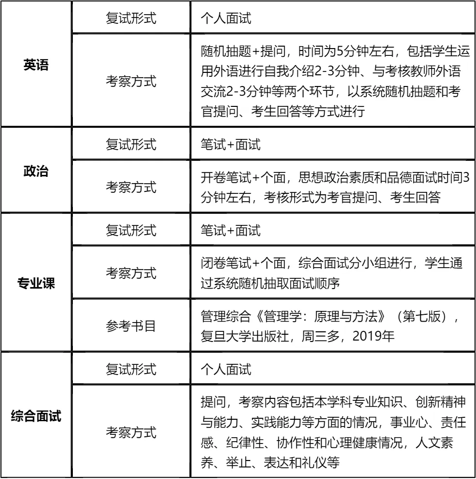 其次,复试成绩中专业课笔试占比最高(40%),必须严格按照指定参考书目《管理学:原理与方法》(第七版)系统复习,确保笔试取得高分;英语面试包含自我介绍和交流环节,需提前准备个性化模板并反复练习。