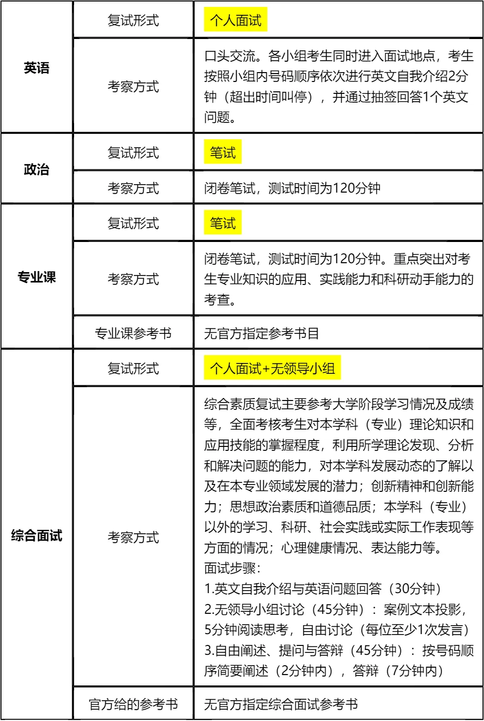 其次,复试考察形式多样,包含四门笔试+面试+无领导小组讨论,专业课无指定参考书,需重点掌握管理学核心理论和实务应用;政治闭卷笔试需提前背诵核心考点;无领导小组讨论需注重团队协作和案例分析逻辑,英文自我介绍需严格控制在2分钟内。