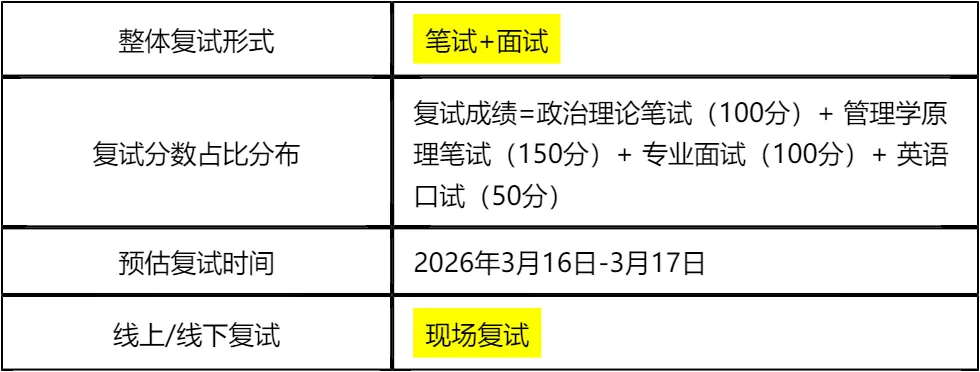 客观分析一波,山西财经大学MBA非全日制复试整体淘汰率20%(中等水平),复试时间预计在 2026 年 3 月 16 日-3 月 17 日,查分后到复试时间间隔较短,需要提前系统性准备。复试形式包含笔试+面试,笔试涉及政治理论和管理学原理,面试包含专业面试、英语口试和综合面试,考察维度全面,不能偏科。