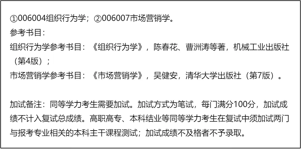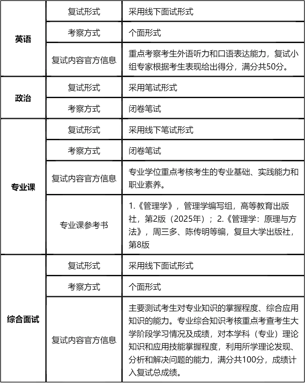 其次,专业课占复试总分的42.9%,是重中之重,需严格按照指定参考书系统复习,重点掌握核心概念和实践应用;政治为闭卷笔试,需提前背诵高频考点;英语和综合面试为个面,需结合自身经历准备个性化答案,展现管理潜质和综合素养。