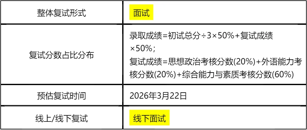 客观分析一波,华中农业大学MBA非全日制复试整体淘汰率极低(仅1%),复试时间预计在 2026 年 3 月 22 日,查分后准备时间相对紧张,建议大家提前启动复试备考,避免临时抱佛脚。整体复试形式为线下面试,无笔试环节,考察模块包括思想政治考核、外语能力考核、综合能力与素质考核(内含专业知识),均为个人面试形式,需要重点打磨面试表达和应答逻辑。