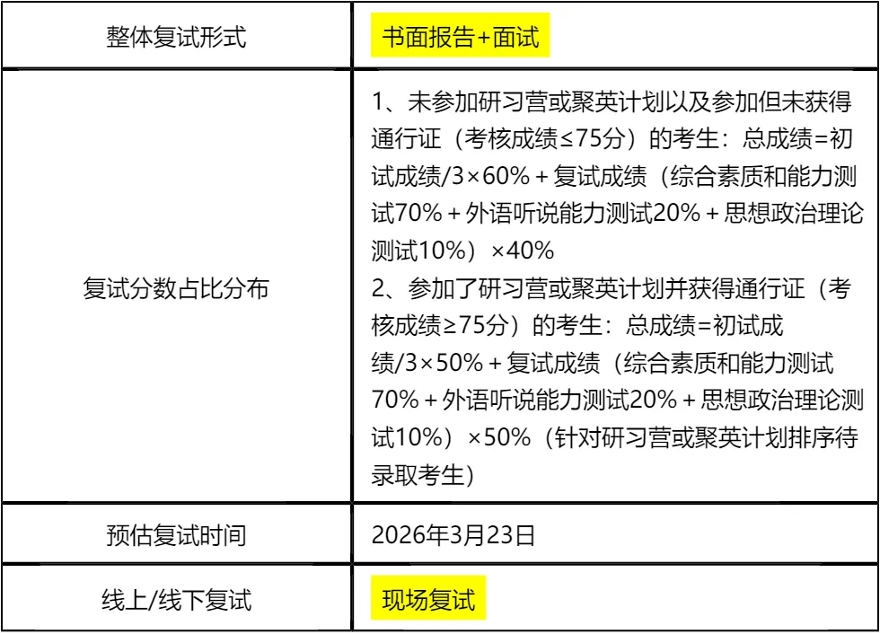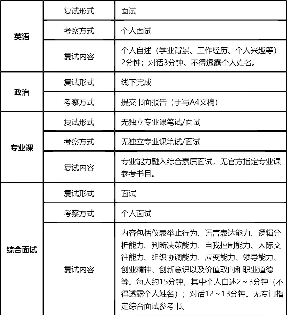 客观分析一波,华中科技大学全日制MBA复试淘汰率23%,属于中等偏上淘汰水平,复试时间预计在2026年3月23日,查分后准备时间有限,需要提前规划备考。复试形式为书面报告+线下面试,包含英语、政治、综合素质等多个考察板块,且政治要求提交手写书面报告,需提前预留书写和打磨时间。