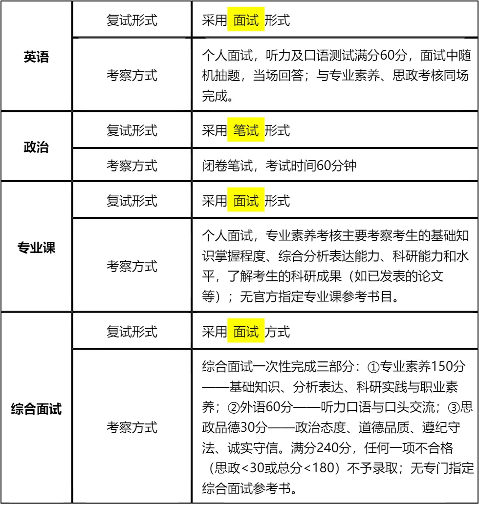 复习建议:真题是复试备考的核心,学校未指定专业课和综合面试参考书,因此高频面试真题的背诵和模拟练习尤为重要。我已将涵盖英语、政治、专业课、综合面试的核心真题整理在文末,集中精力背诵7-10天即可全面掌握!备考时间紧张,务必聚焦重点高频考点,避免盲目复习,文末真题和资料一定要认真研读背诵,复试通关难度不大!