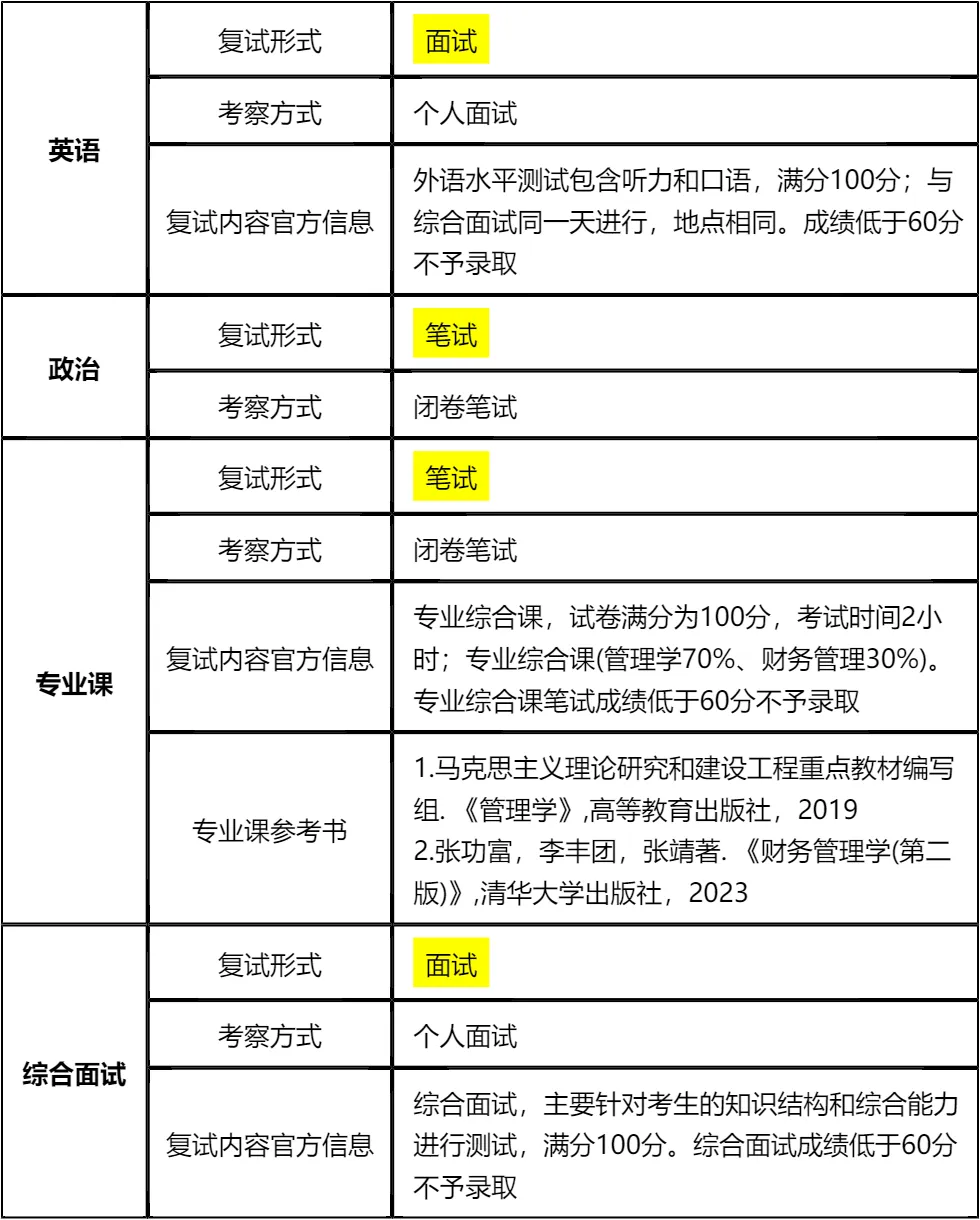 复习建议:专业课要重点围绕指定参考书《管理学》和《财务管理学(第二版)》进行复习,占比70%的管理学是重中之重;政治笔试需关注核心考点记忆;英语和综合面试要结合真题多做模拟练习。我把涵盖复试英语口语、政治、专业综合面试的核心真题资料都放在文末了,大家下载后针对性背诵,聚焦高频考点,高效利用复习时间,避免盲目备考。总之,复试各环节都有明确分数占比和合格要求,务必全面准备,重点突破,才能稳妥上岸!!!