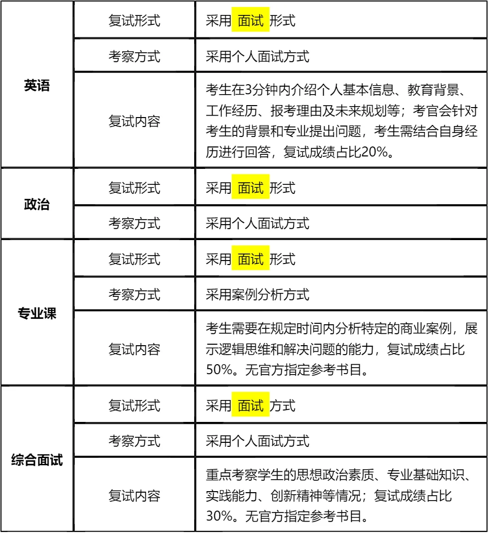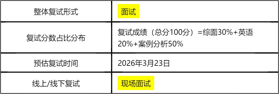 客观分析一波,南方科技大学MBA非全日制复试整体淘汰率较低(9%左右),复试时间预计在 2026 年 3 月 23 日左右,查分后准备时间有限,建议大家提前启动复试备考。整体复试形式为纯面试,无笔试环节,包含综面、英语、案例分析三大核心板块,其中案例分析占比最高(50%),是复试成败的关键,需要重点准备商业案例分析思路和逻辑表达能力。