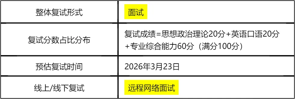 客观分析一波,广东金融学院全日制MBA复试整体淘汰率0%(一志愿全部录取),复试时间预计在 2026 年 3 月 23 日,查分时间和复试时间间隔约27天,所以大家需要提前准备复试,避免出分后时间紧张。整体上复试仅为面试形式,无笔试环节,面试为个人面试,需提前熟悉个面流程和答题技巧。
