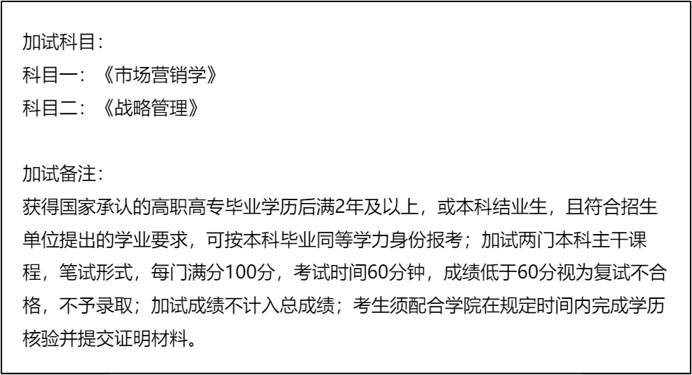 对于同等学力考生,要额外重视加试科目,《市场营销学》和《战略管理》两门课程需认真复习,加试成绩低于60分将直接淘汰,不能掉以轻心。资格审查材料要按要求准备齐全,确保符合报考条件和复试要求,避免因材料问题影响复试资格。