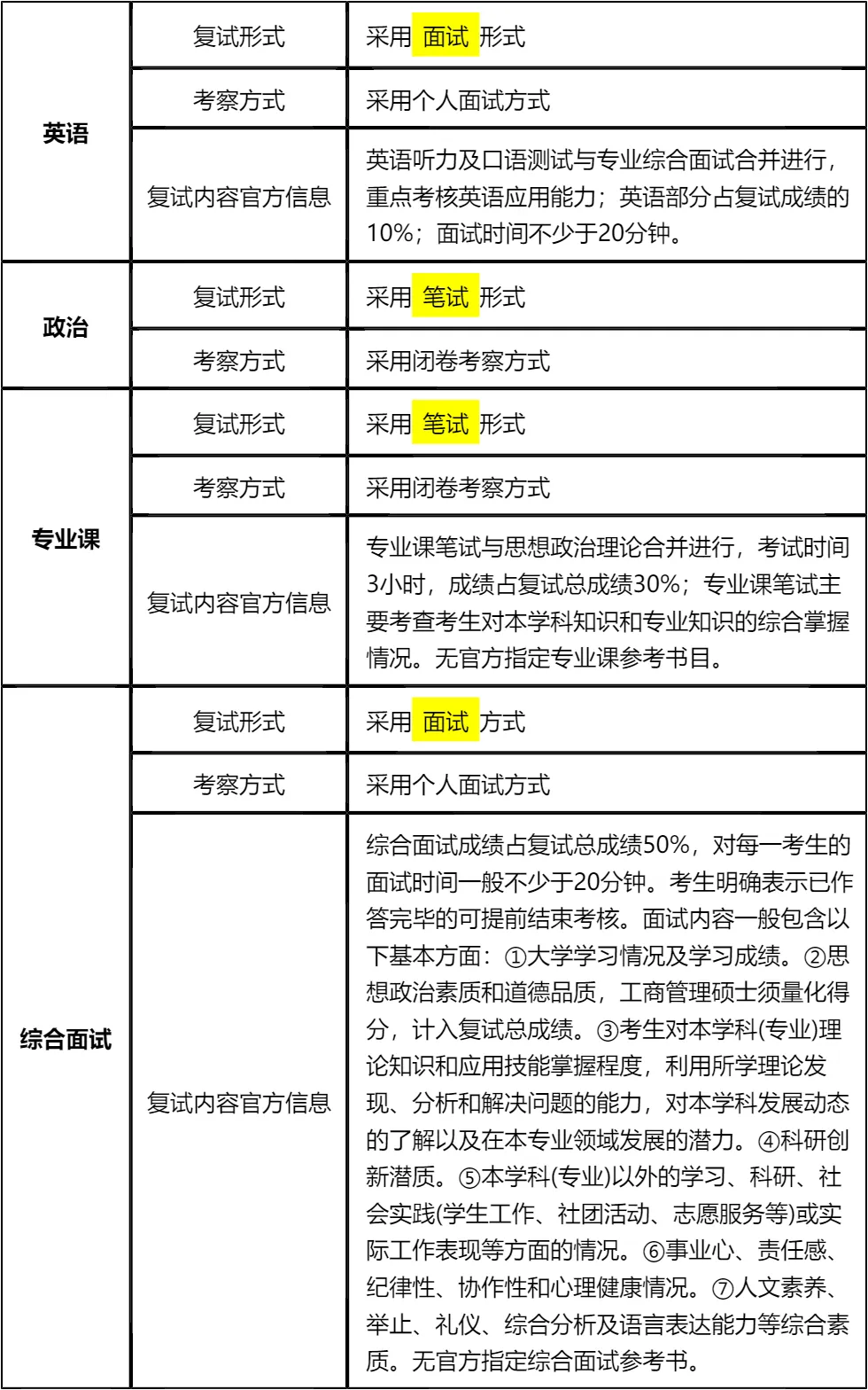 客观分析一波,北方工业大学MBA非全日制复试整体淘汰率较低(仅3%),复试时间预计在 2026 年 3 月 23 日,查分时间和复试时间间隔较短,大家需要提前启动复试准备,避免临时抱佛脚。整体复试形式为笔试+面试,面试均为个人面试,无需准备小组面试相关内容,重点攻克个人面试的表达逻辑和专业知识储备。