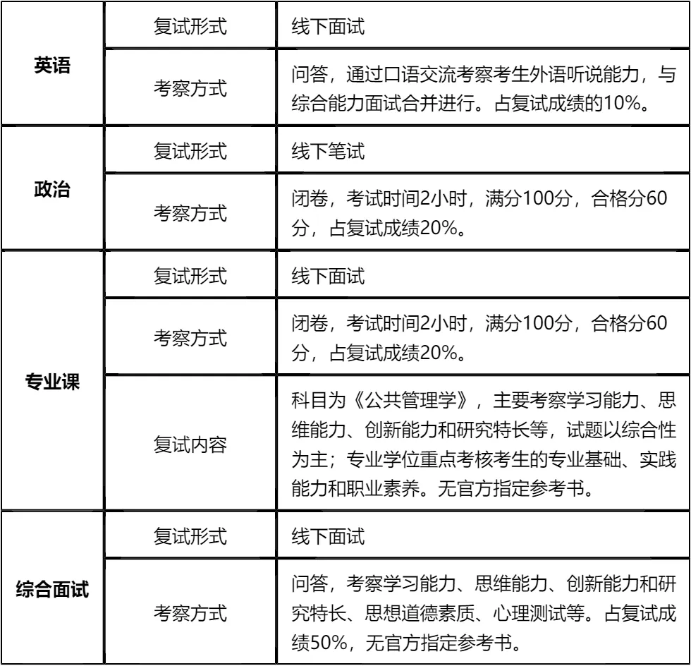 其次,复试各板块都有明确的考察重点和分值占比。综合能力面试占比50%,是重中之重,需要提前梳理个人工作经历、职业规划,关注公共管理领域的热点问题,形成自己的见解;专业课《公共管理学》和政治都是闭卷笔试,且有合格线要求,必须扎实复习,确保达到60分以上,这是底线;英语虽然占比只有10%,但也需要熟练掌握自我介绍和常见问答,避免因英语表现太差影响整体成绩。