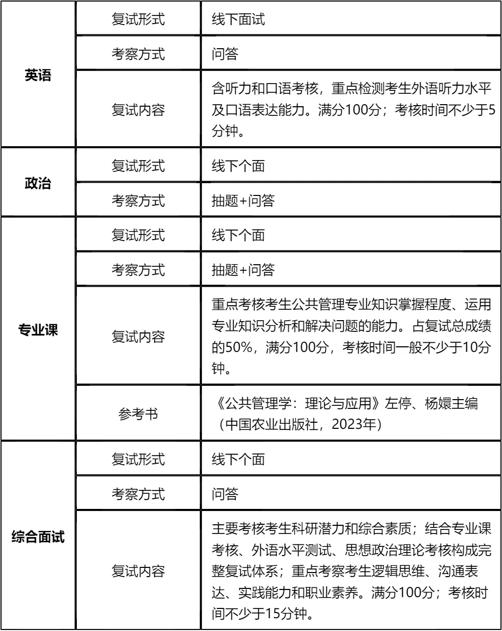 复习建议:一定要把真题作为复习的核心,同时紧扣官方指定参考书和考核要求。英语需强化听力和口语训练,政治要聚焦指定期刊和教材内容,专业课重点掌握公共管理核心概念和实践应用能力。我把真题及涵盖复试全科目核心资料都放在文末了,大家下载后针对性背诵练习,抓住重点高效备考,其实复试难度不大,只要认真准备就能稳妥上岸!!!