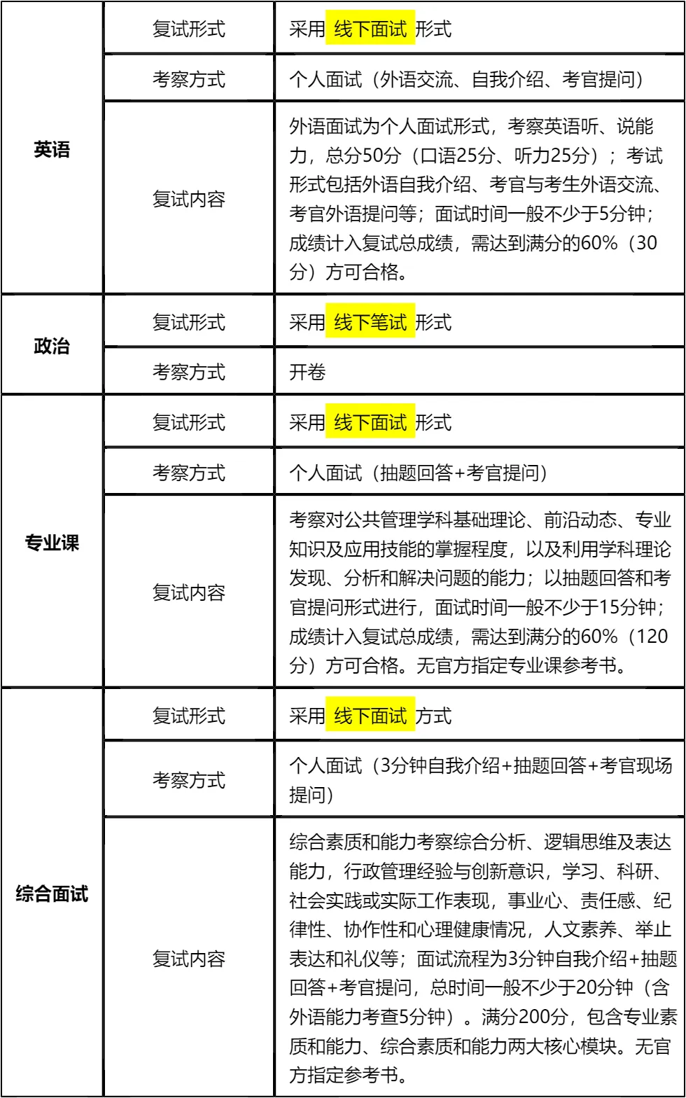 复习建议:一定要把真题作为复习的核心,政治笔试为开卷考试,但需熟悉指定教材和时事政策;英语面试有明确的自我介绍和问答环节,需提前背诵模板并强化口语表达;专业课无官方指定参考书,需围绕公共管理核心理论和前沿动态准备。我把真题及涵盖英语、政治、专业综合面试的全套资料都放在文末了,大家下载后认真背诵练习,聚焦高频考点高效备考,避免盲目复习,其实只要掌握核心内容,复试通关并不难!!!