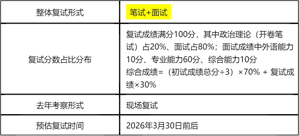 复习建议:首先要明确目标分数,210分以上录取把握最大,低于180分的考生需做好充分准备应对竞争。其次,复试中面试占比80%,英语、专业能力、综合能力均在面试中考察,需重点强化口语表达和专业知识应用能力。政治为开卷笔试,虽无需死记硬背,但需熟悉相关政策理论,提升分析论述能力。真题是复习核心,文末整理了涵盖英语、政治、专业课、综合面试的完整真题资料,下载后集中背诵练习,聚焦高频考点,避免盲目复习,提高备考效率!