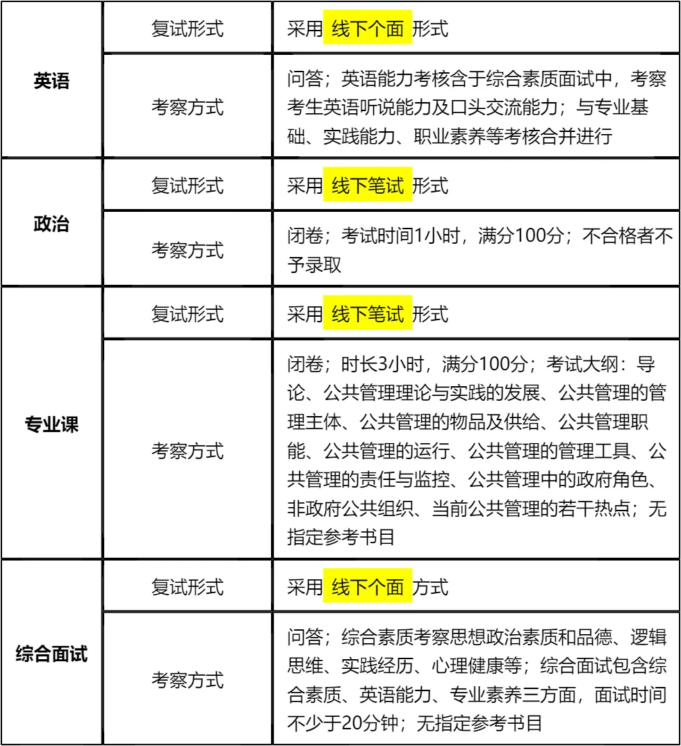 客观分析一波,内蒙古师范大学全日制MPA复试整体淘汰率较低(6%左右),复试时间预计在 2026 年 3 月 31 日前后,查分时间和复试时间间隔较短,所以大家需要提前准备复试,避免出分后时间仓促。整体上复试以笔试+面试为主,其中面试形式为个面,需提前熟悉个面流程和答题技巧。