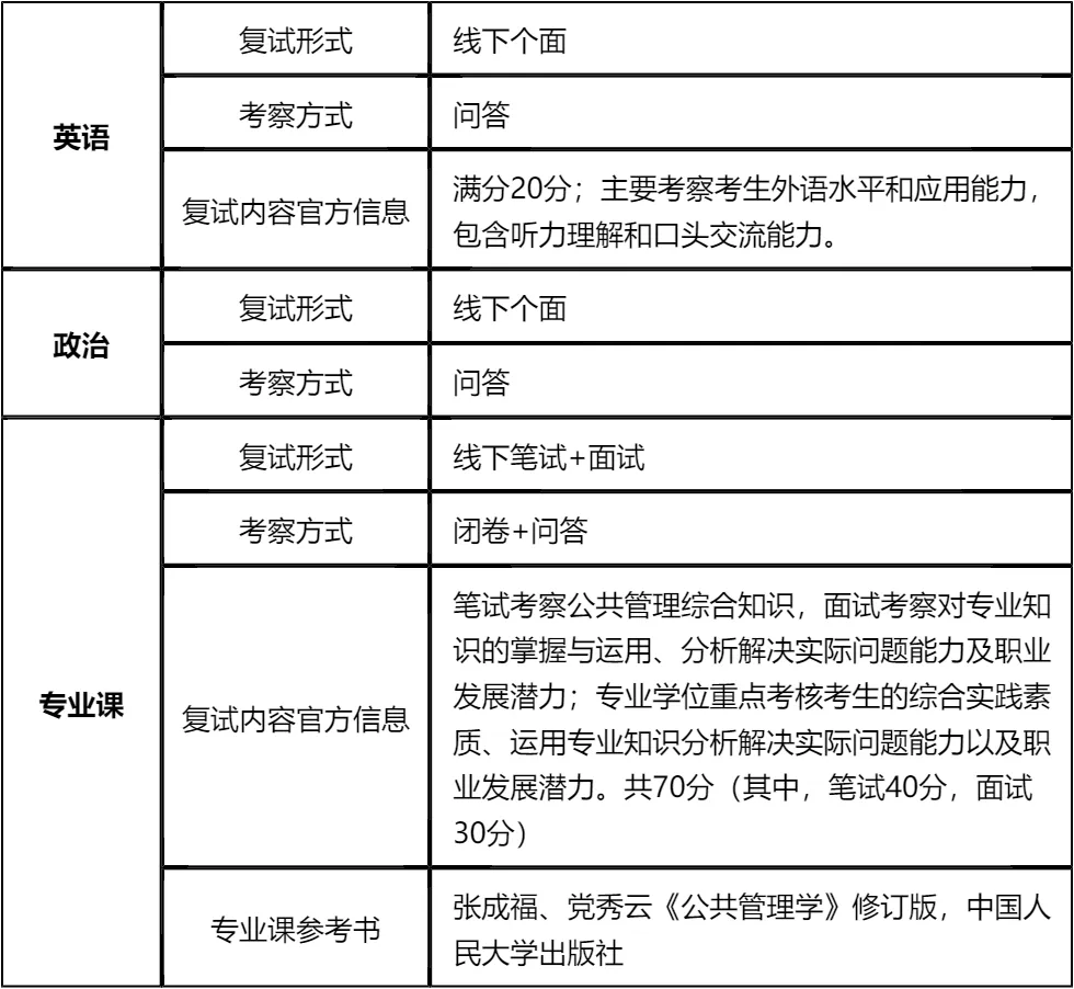 复习建议:专业课有明确参考书目(张成福、党秀云《公共管理学》修订版),一定要吃透教材核心知识点,同时把真题作为重点复习内容。我把真题及涵盖英语、政治、专业综合面试的所有核心资料都放在文末了,大家下载后认真背诵练习,集中精力复习10-15天可全面覆盖考点!注意同等学力考生需额外准备加试科目(管理学原理、社会调查与研究方法),加试不合格直接淘汰,务必重视。总之,备考要突出重点,拒绝盲目复习,文末真题和资料一定要认真对待,其实通过复试并不难!!!