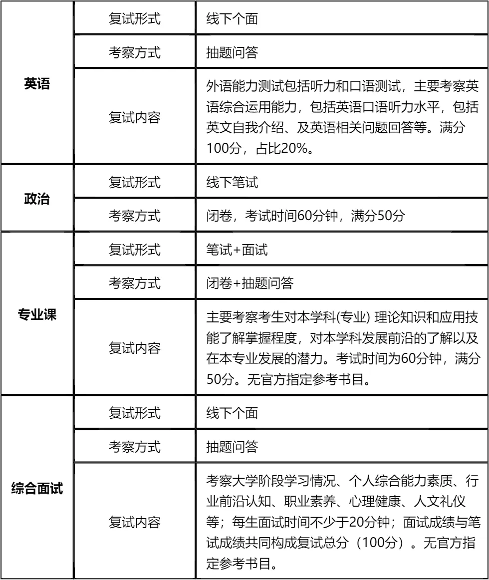 复习建议:复试涉及英语、政治、专业课、综合面试四大板块,其中政治为闭卷笔试且无指定参考书,专业课和综合面试也无官方参考书目,真题和核心考点梳理至关重要。我把涵盖所有复试科目的真题及资料整理在文末,大家下载后重点背诵高频考点,集中精力复习10-15天即可覆盖核心内容!不用盲目备考,抓重点、练真题是关键,文末资料一定要认真研读,上岸概率很高!!!