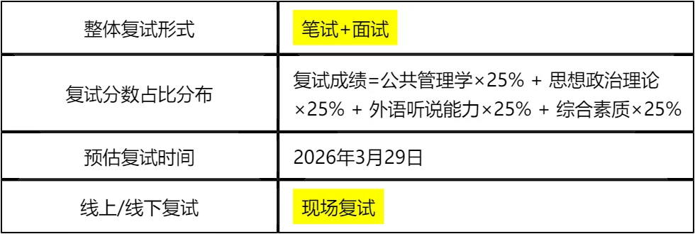 客观分析一波,湖北大学非全日制MPA复试整体淘汰率为0%(一志愿全部录取),复试时间预计在 2026 年 3 月 29 日,查分时间和复试时间间隔较短,所以大家需要提前准备复试,避免出分后时间紧张。整体上复试以面试+笔试为主,其中综合面试为抽题问答形式,需要提前熟悉答题思路和技巧。