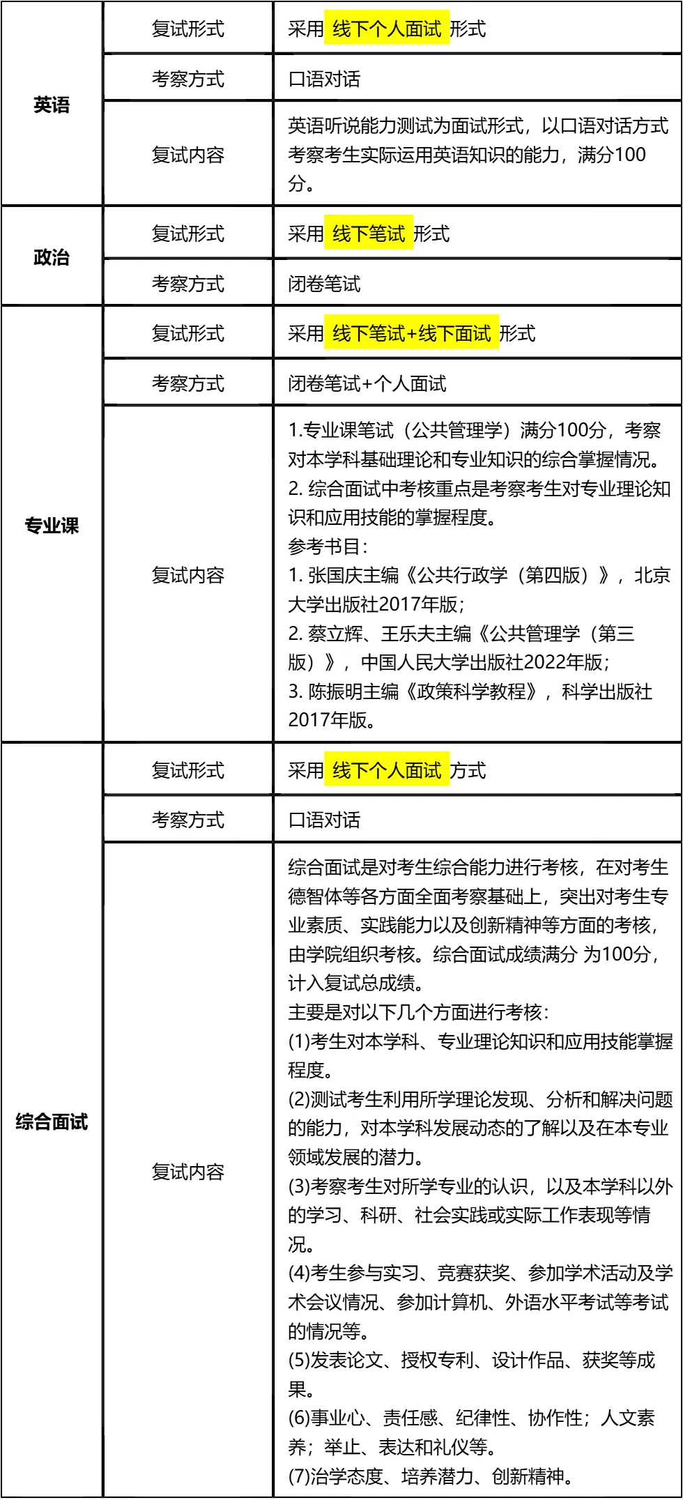 复习建议:专业课笔试要重点研读指定参考书目,扎实掌握公共管理学基础理论和专业知识;政治笔试需提前背诵核心考点,闭卷考试要求知识点记忆牢固;英语和综合面试要多进行模拟练习,熟悉对话节奏和答题思路。真题是重要的复习资料,文末整理了各板块高频真题,下载后要认真背诵练习,聚焦重点、高效备考,才能提高复试通过率!