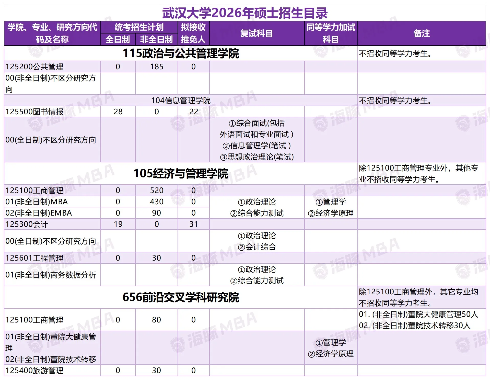 武汉大学 是管理类联考考生重点关注的院校之一,涵盖 MBA、MPA、MPAcc、MEM 等多个专业方向。 本页面系统整合了院校介绍、专业设置、招生简章、历年分数线及相关资讯与问答内容, 适合作为考生进行院校对比、专业选择与长期信息查询的核心参考入口。