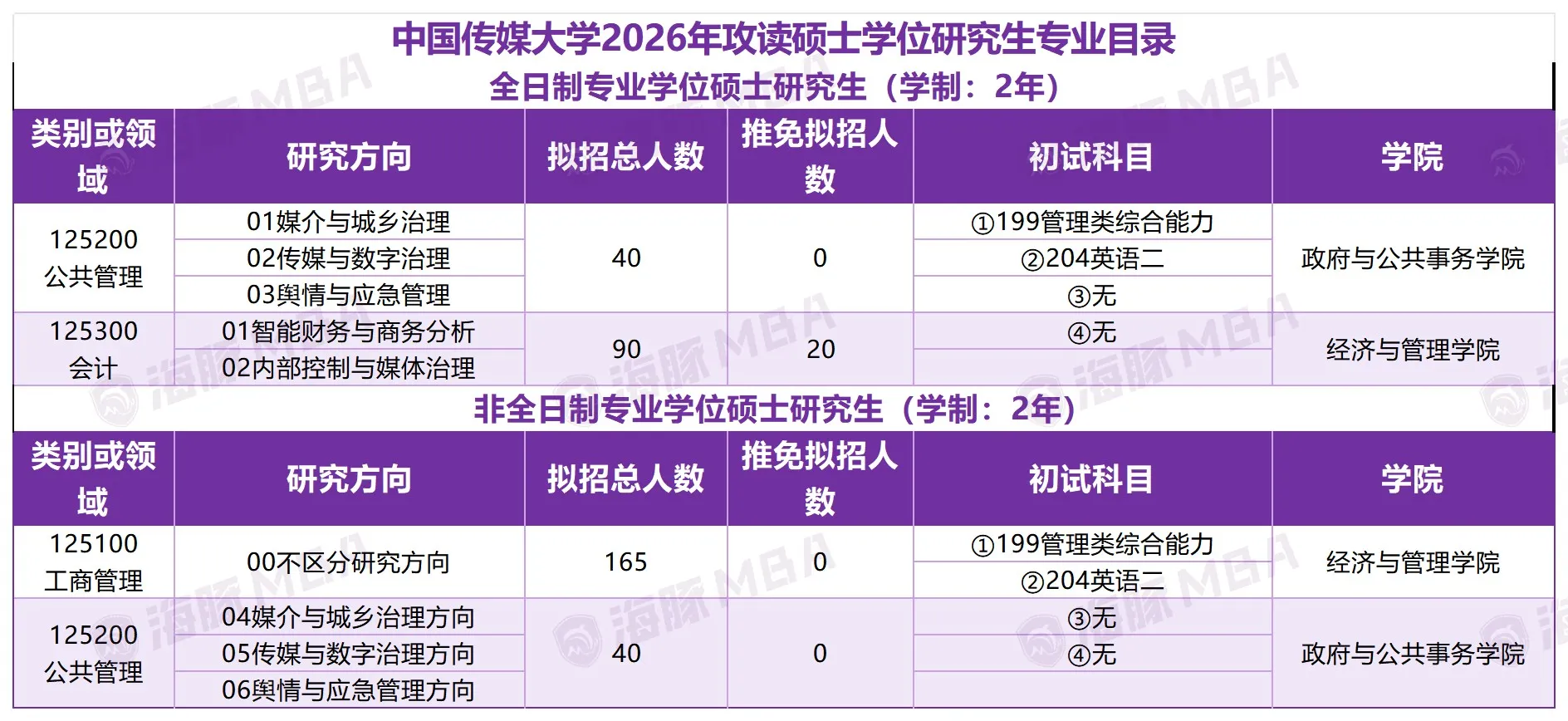 中国传媒大学 是管理类联考考生重点关注的院校之一,涵盖 MBA、MPA、MPAcc、MEM 等多个专业方向。 本页面系统整合了院校介绍、专业设置、招生简章、历年分数线及相关资讯与问答内容, 适合作为考生进行院校对比、专业选择与长期信息查询的核心参考入口。