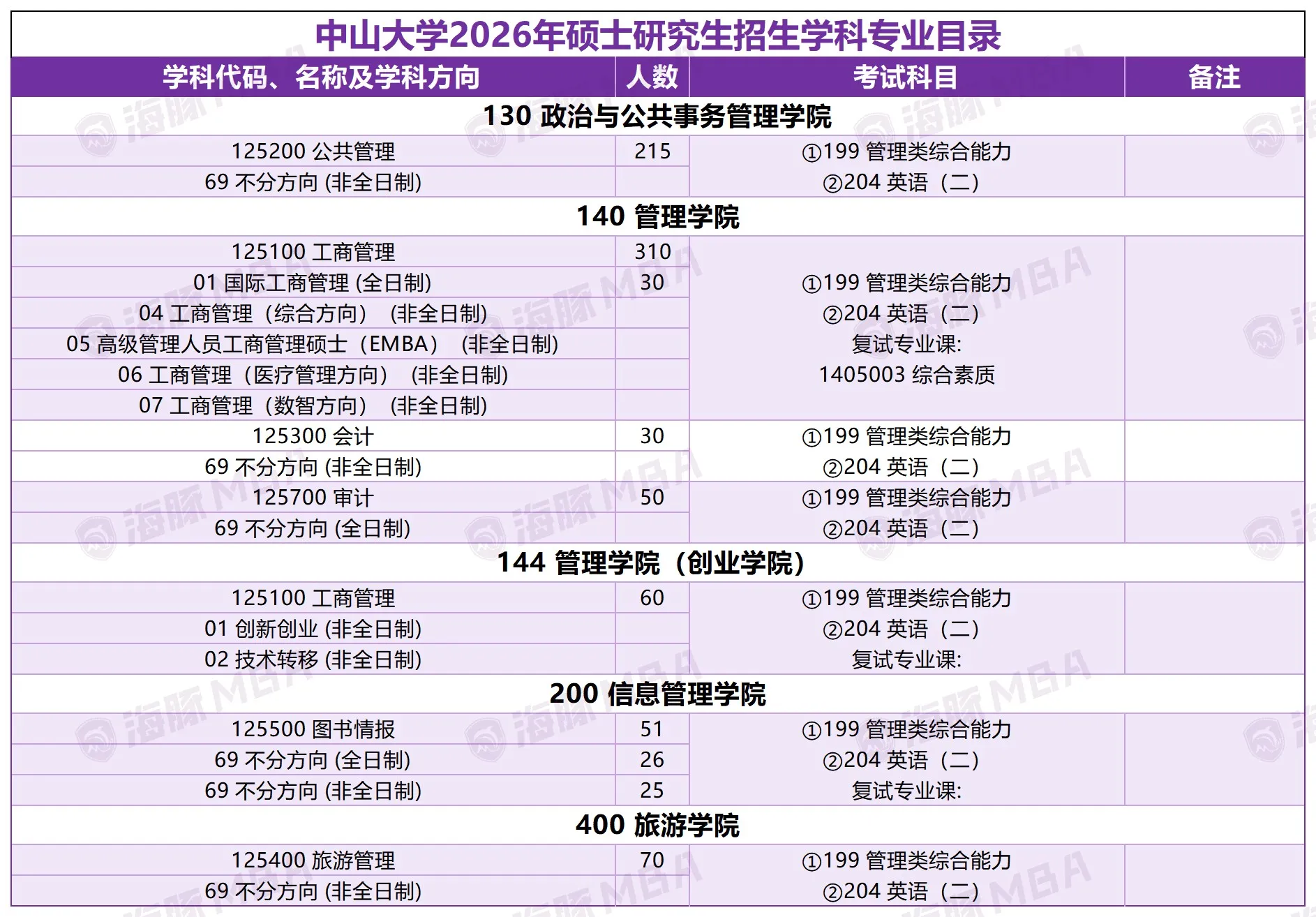 中山大学 是管理类联考考生重点关注的院校之一,涵盖 MBA、MPA、MPAcc、MEM 等多个专业方向。 本页面系统整合了院校介绍、专业设置、招生简章、历年分数线及相关资讯与问答内容, 适合作为考生进行院校对比、专业选择与长期信息查询的核心参考入口。